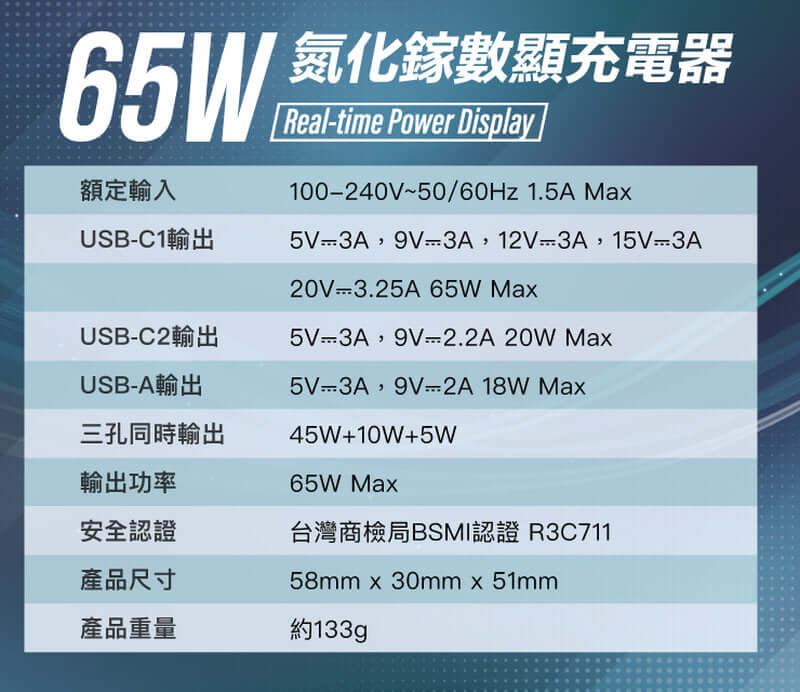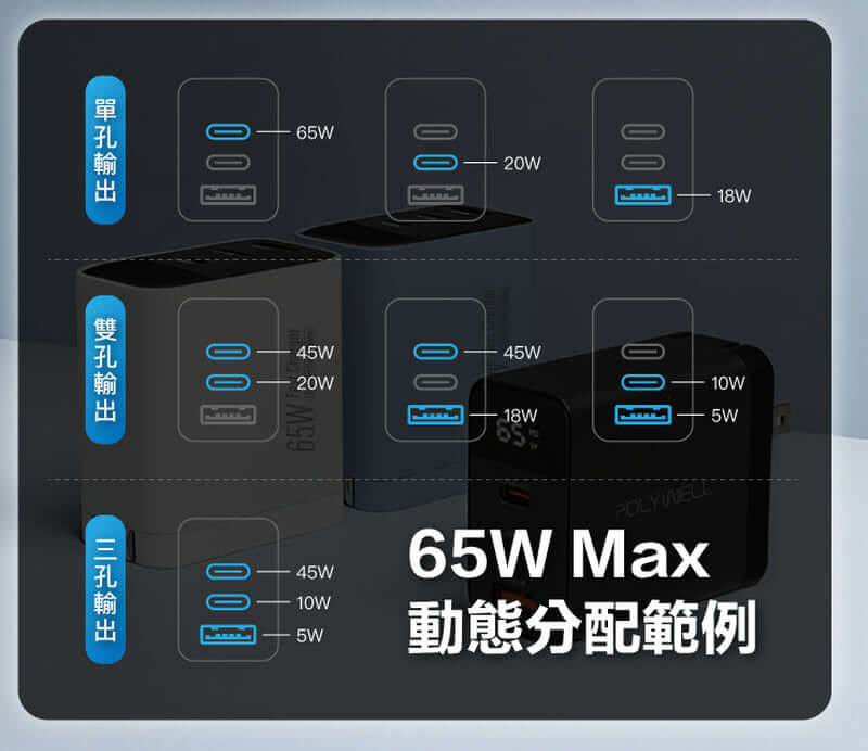 【智慧電源分流】根據設備需求動態分配充電功率,達到最佳充電效果,最大總輸出65W