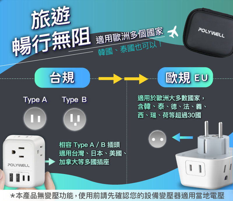 註1:多國轉接插座獨立使用時「無變壓功能」,使用前請注意「電器原電壓規格」是否與當地電壓相同。如不相同,請勿插入設備使用!若因此造成設備損壞,此為人為使用疏失,非產品保固或保障範圍。