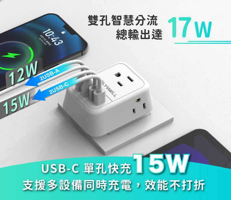 【雙孔快充 輕巧有力】USB-C 單孔15W、USB-A 單孔12W、總輸出17W