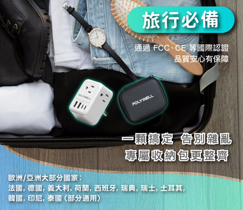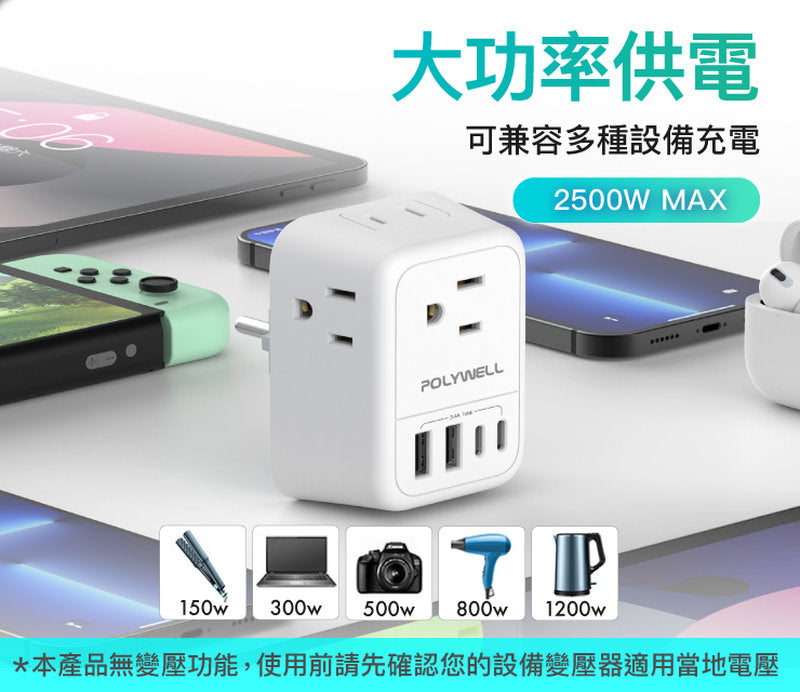 台規插座:相容 Type A / B 插頭適用台灣、日本、美國、加拿大等多國插座