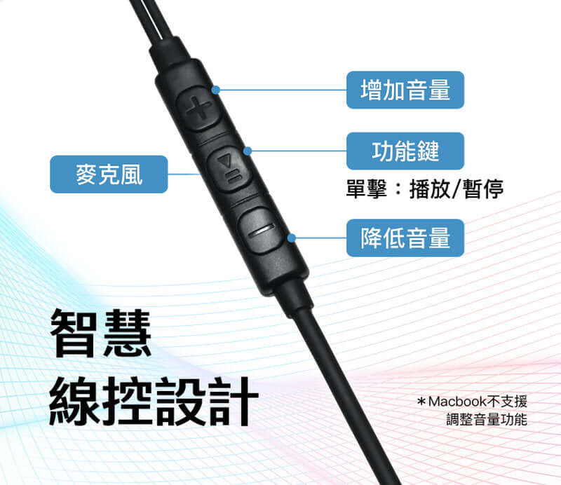 【按鍵式線控】可經由耳機線上控制鈕執行和控制手機音效功能,音量/來電接聽/音樂上下首;搭配安卓手機,可同步調整手機音量設定(註1)