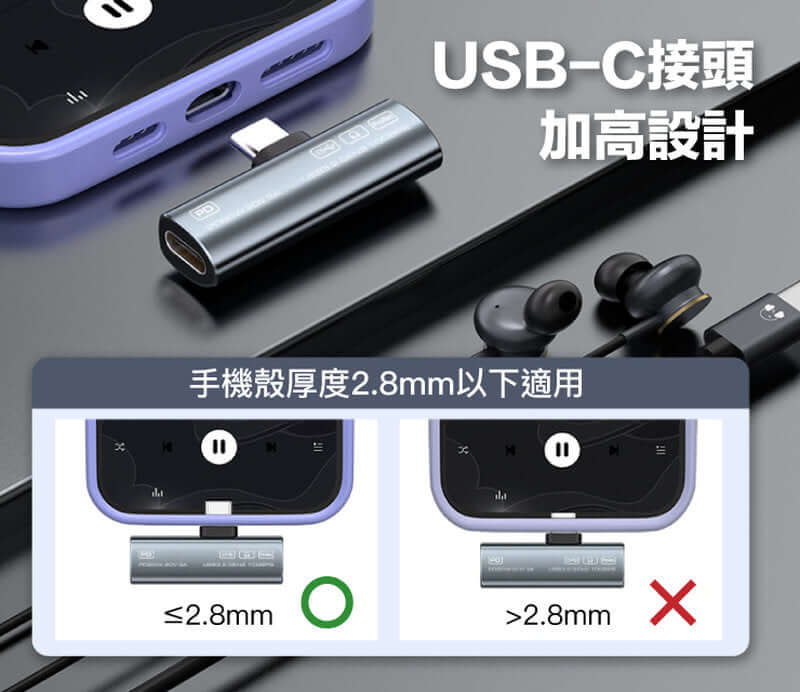 - 連接Type-C埠到Type-C音源插座 (含麥克風功能),可聽歌、通話、線控
