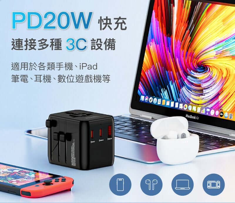【20W快充輸出】連接多種3C設備:筆電、平板、手機皆可快速充電不延誤。