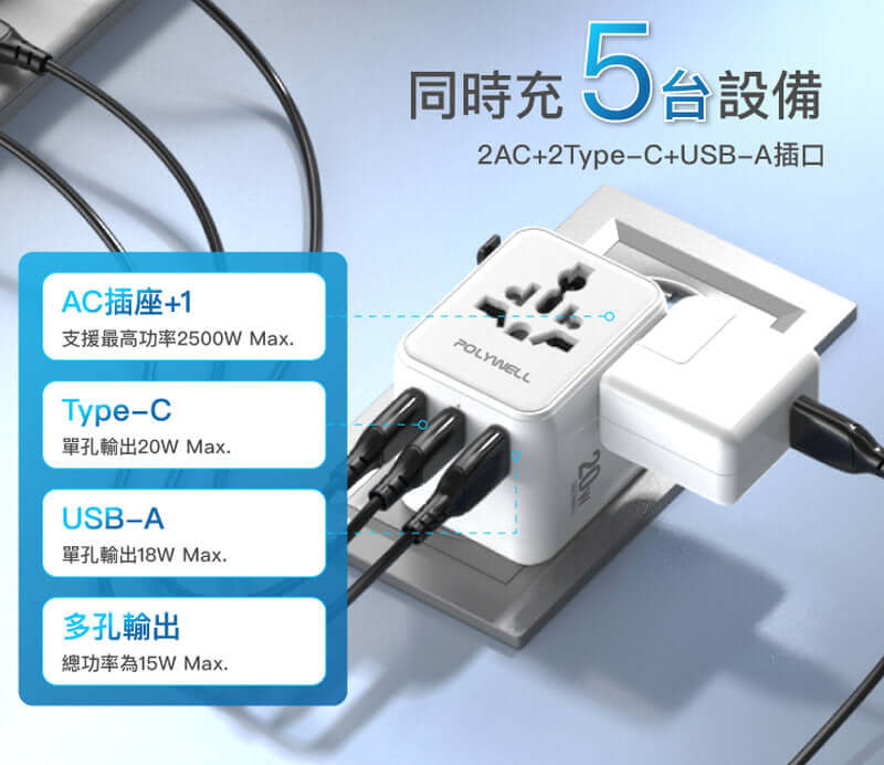 【多孔同時充】配備特殊雙AC插座設計, 可多轉接一組電器設備; 同時具備2×Type-C和1×USB埠,支援多設備同時充電,效率高不佔插座空間。