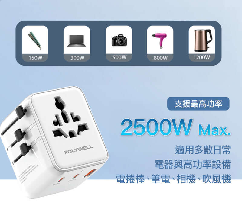 【適用大功率電器】最大支援2500W功率,可安全使用吹風機、熱水瓶等高耗電設備,穩定供電不跳電。