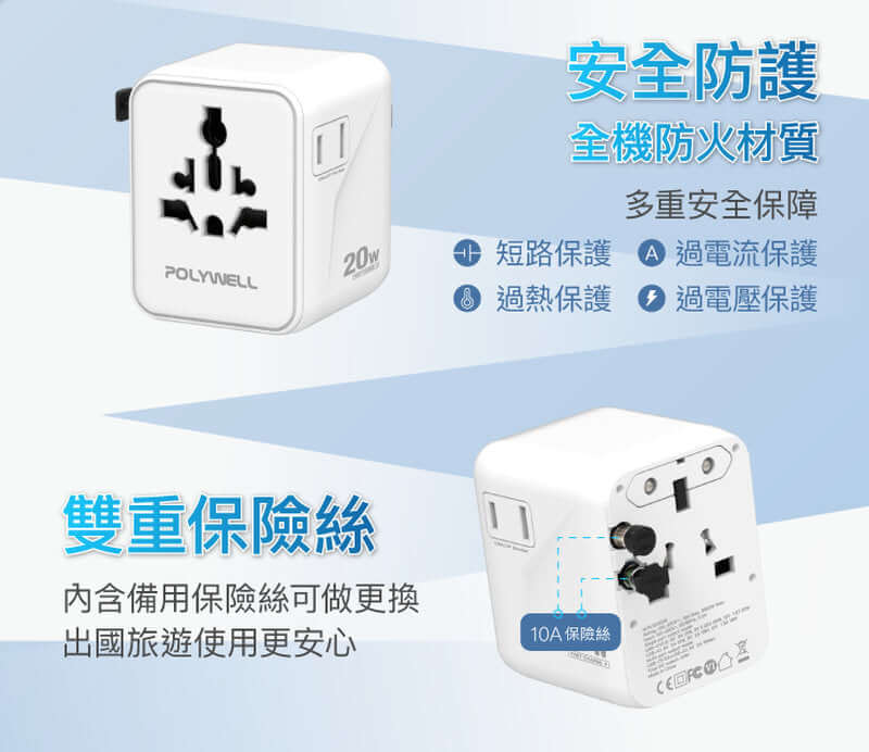 【多重安全防護】採防火材質並內建雙10A保險絲,防過載、過熱、短路等保護機制,充電更安心。
