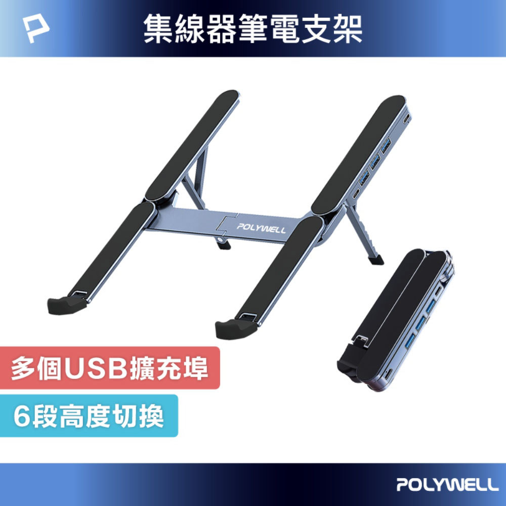 集線器筆電支架 6段高度 USB3.0+USB-C擴充埠 可折疊收納 鋁合金材質